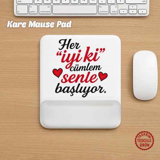 Her "İyi Ki" Cümlem Senle Başlıyor Kare Mouse Pad şükran dolu bir aşkı simgeler. Bu içten ve romantik slogan, sevdiğiniz kişinin hayatınızdaki varlığının kıymetini vurgular. Çalışma masanızda sürekli bir sevgi hatırlatıcısı ve neşe kaynağı yaratın. Yüksek kaliteli kumaş yüzey ve kaymaz taban ile üretilmiştir, uzun ömürlü ve rahat bir kullanım sunar. Kare formu her türlü çalışma alanına kolayca uyum sağlar. Bu romantik mouse pad, sevgiliye, eşe veya nişanlıya mükemmel bir hediye seçeneğidir.