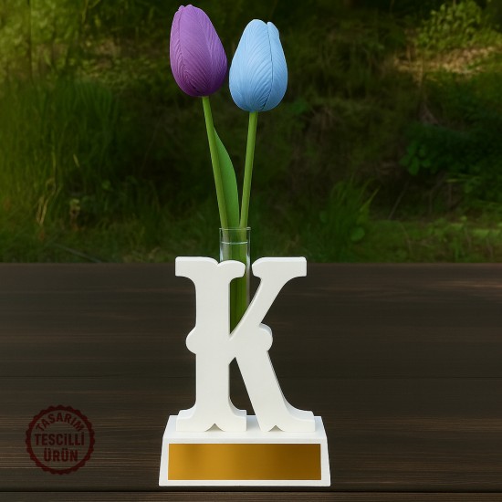 K Harfi Vazo, modern dekorasyon anlayışını kişisel baş harf detayıyla bir araya getiren şık ve özgün bir tasarımdır. Harf formundaki yapısı sayesinde klasik vazo modellerinden ayrılır ve bulunduğu ortamda güçlü bir dekoratif etki oluşturur. Ev, ofis, çalışma masası, raf ve masa üstü alanlarda rahatlıkla kullanılabilir.