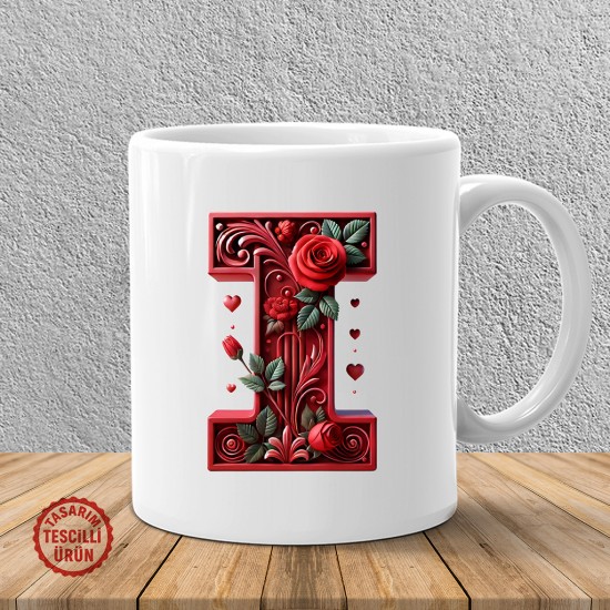 Etiketler: I harfi, kırmızı gül, romantik, kişiye özel, aşk, hediye, sevgililer günü, zarif, kupa bardak, tasarım.