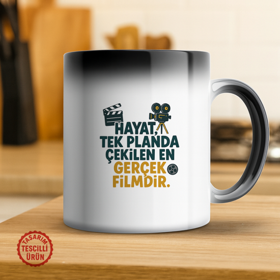 Yaşamın, tekrarı olmayan, kesintisiz ve tamamen gerçek bir sahne (tek plan çekim) olduğu felsefesini savunan, anı yaşamayı ve her anın değerini bilmeyi öğütleyen derin bir manifesto: Hayat Tek Planda Çekilen En Gerçek Filmdir Sihirli Kupa Bardak. Bu sihirli kupa, soğukken gizemli ve sade bir görünüm sergiler. Ancak içine sıcak içecek (kahve, çay vb.) eklediğinizde yüzeyindeki düşündürücü mesaj ortaya çıkar: "Hayat Tek Planda Çekilen En Gerçek Filmdir". Bu sihirli an, size yaşamın eşsizliğini, hataların geri alınamazlığını ve her anın bir sonraki sahneyi etkilediği gerçeğini hatırlatır.