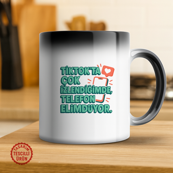 Tiktok'ta bir videonun viral olmasıyla birlikte yaşanan o yoğun heyecan, şaşkınlık ve anlık şok nedeniyle telefonu elde tutamama durumunu mizahi bir dille özetleyen, duygusal tepkisi yüksek içerik üreticilerine özel bir manifesto: Tiktok'ta Çok İzlendiğimde, Telefon Elimden Düşüyor Sihirli Kupa Bardak. Bu sihirli kupa, soğukken gizemli ve sade bir görünüm sergiler. Ancak içine sıcak içecek (kahve, şok çayı vb.) eklediğinizde yüzeyindeki komik mesaj ortaya çıkar: "Tiktok'ta Çok İzlendiğimde, Telefon Elimden Düşüyor". Bu sihirli an, size başarının getirdiği beklenmedik şoku, aşırı duygusal tepkileri ve kontrolsüz heyecanın mizahını hatırlatır.