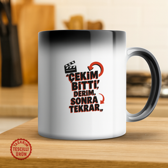 İçerik üreticiliğinin bitmek bilmeyen döngüsünü, "tamamdır" dediğiniz anın bile bir yanılsama olduğunu ve sürekli daha iyisini yapma arayışının getirdiği yorgunluğu mizahi bir dille özetleyen manifesto: Çekim Bitti Derim, Sonra Tekrar Sihirli Kupa Bardak. Bu sihirli kupa, soğukken gizemli ve sade bir görünüm sergiler. Ancak içine sıcak içecek (kahve, çay vb.) eklediğinizde yüzeyindeki komik mesaj ortaya çıkar: "Çekim Bitti Derim, Sonra Tekrar". Bu sihirli an, size mükemmeliyetçiliğin bedelini, bitmeyen çekimlerin yarattığı dramı ve içerik üretiminin tatlı eziyetini hatırlatır.