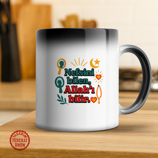 Manevi yolculuğun en temel ilkesini, kendini keşfetmenin (nefsini bilme), Yaratıcıyı idrak etmeye (Allah'ı bilme) giden en kesin yol olduğunu savunan, derin felsefi bir manifesto: Nefsini Bilen, Allah'ı Bilir Sihirli Kupa Bardak. Bu sihirli kupa, soğukken gizemli ve sade bir görünüm sergiler. Ancak içine sıcak içecek (kahve, tefekkür çayı vb.) eklediğinizde yüzeyindeki bilgece mesaj ortaya çıkar: "Nefsini Bilen, Allah'ı Bilir". Bu sihirli an, size içsel dünyanın sırrını, kişisel farkındalığın ve hakikati arayışın önemini hatırlatır.