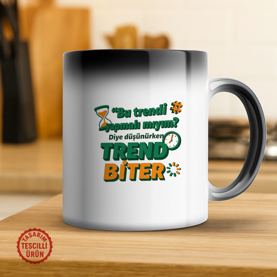 Sosyal medya trendlerinin hızı karşısında yaşanan kararsızlık, zamanlama hatası ve fırsatın kaçırılması ironisini mizahi bir dille özetleyen, düşünürken trendi kaçıranlara özel bir manifesto: "Bu Trendi Yapmalı mıyım" Diye Düşünürken Trend Biter Sihirli Kupa Bardak. Bu sihirli kupa, soğukken gizemli ve sade bir görünüm sergiler. Ancak içine sıcak içecek (kahve, çay vb.) eklediğinizde yüzeyindeki komik mesaj ortaya çıkar: "'Bu Trendi Yapmalı mıyım' Diye Düşünürken Trend Biter". Bu sihirli an, size ertelemenin bedelini, hızlı karar verme zorunluluğunu ve sosyal medyanın acımasız temposunu hatırlatır.