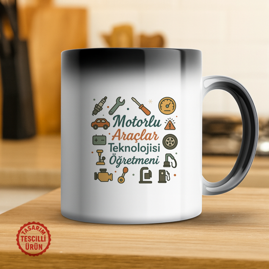 Geleceğin ustalarını yetiştiren, atölyenin tozunu yutmuş, motor sesinin ritmini bilen değerli eğitimcilere özel bir manifesto: Motorlu Araçlar Teknolojisi Öğretmeni Sihirli Kupa Bardak. Bu sihirli kupa, soğukken gizemli ve sade bir görünüm sergiler. Ancak içine sıcak içecek (kahve, atölye çayı vb.) eklediğinizde yüzeyindeki mesleki gurur ortaya çıkar: "Yolların Ustası (Motor ve Emek Sizinle)". Bu sihirli an, size oto tamirin ustalığını, mekanik sistemlerin dilini bilmenin gücünü ve öğretmenliğin getirdiği manevi tatmini hatırlatır. Ustalığınızı ve teknik bilginizi bu kupanın sıcaklığıyla sürekli canlı tutun.